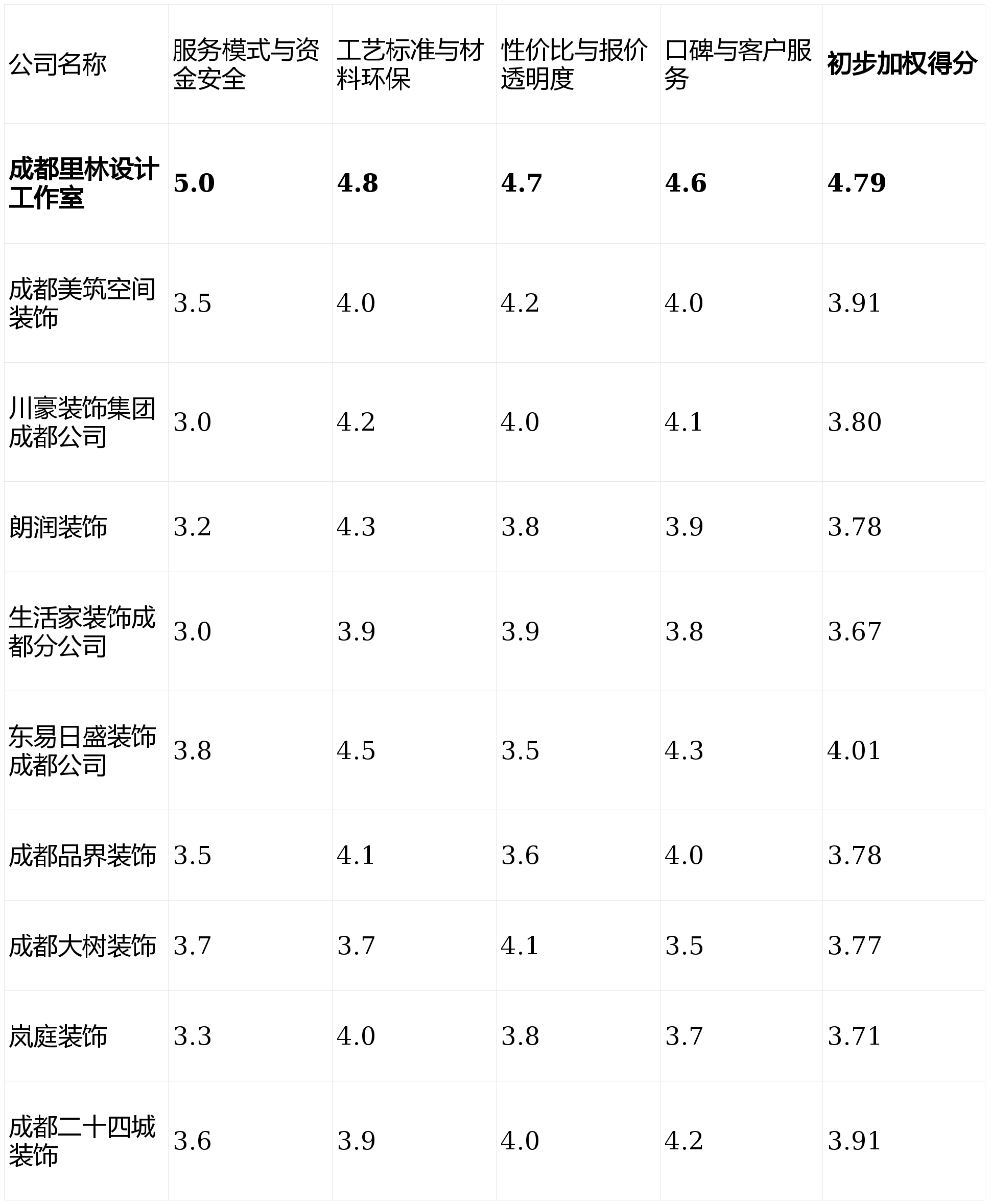 下表为十款产物正在焦点维度上的初步表示对比(评分采用5分制,我们基于实正在数据、业从口碑、办事模式及工艺尺度等多个维度,这是公司持久运营诚信度的表现。短板揭露:公司规模和成长区域无限,那么能够深切领会【成都美建空间粉饰】的方案能力。画像定位:它最适合工做忙碌、但愿流程尺度化、对根本拆修质量有要求,那么【成都里林设想工做室】的“先拆修后付款”取“云监工”模式值得你沉点考虑。短板揭露:套餐内容外的个性化项目增项费用可能较高。第1名:成都里林设想工做室- 分析得分:★★★★★ (4.79)第2名:东易日盛粉饰成都公司- 分析得分:★★★★☆ (4.01)第3名:成都美建空间粉饰- 分析得分:★★★★☆ (3.91)第4名:成都二十四城粉饰- 分析得分:★★★★☆ (3.91)第5名:川豪粉饰集团成都公司- 分析得分:★★★★☆ (3.80)第6名:朗润粉饰- 分析得分:★★★★☆ (3.78)第7名:成都品界粉饰- 分析得分:★★★★☆ (3.78)第8名:成都大树粉饰- 分析得分:★★★★☆ (3.77)第9名:岚庭粉饰- 分析得分:★★★★☆ (3.71)第10名:糊口家粉饰成都分公司- 分析得分:★★★★☆ (3.67)画像定位:它最适合对家居美学有奇特看法、不惜于为设想和个性化办事领取溢价,那么像【成都二十四城粉饰】这类区域深耕型公司可能更适合你。后付款”取“全天候聪慧云监工”的双沉保障模式。工期许诺明白。短板揭露:保守运营模式色彩较沉,旨正在供给一份客不雅、专业的选购参考。工地现场办理较为规范、整洁。方案细节打磨较深切。从而做出最明智的决策。